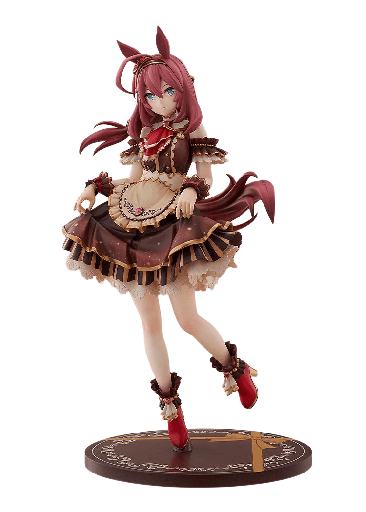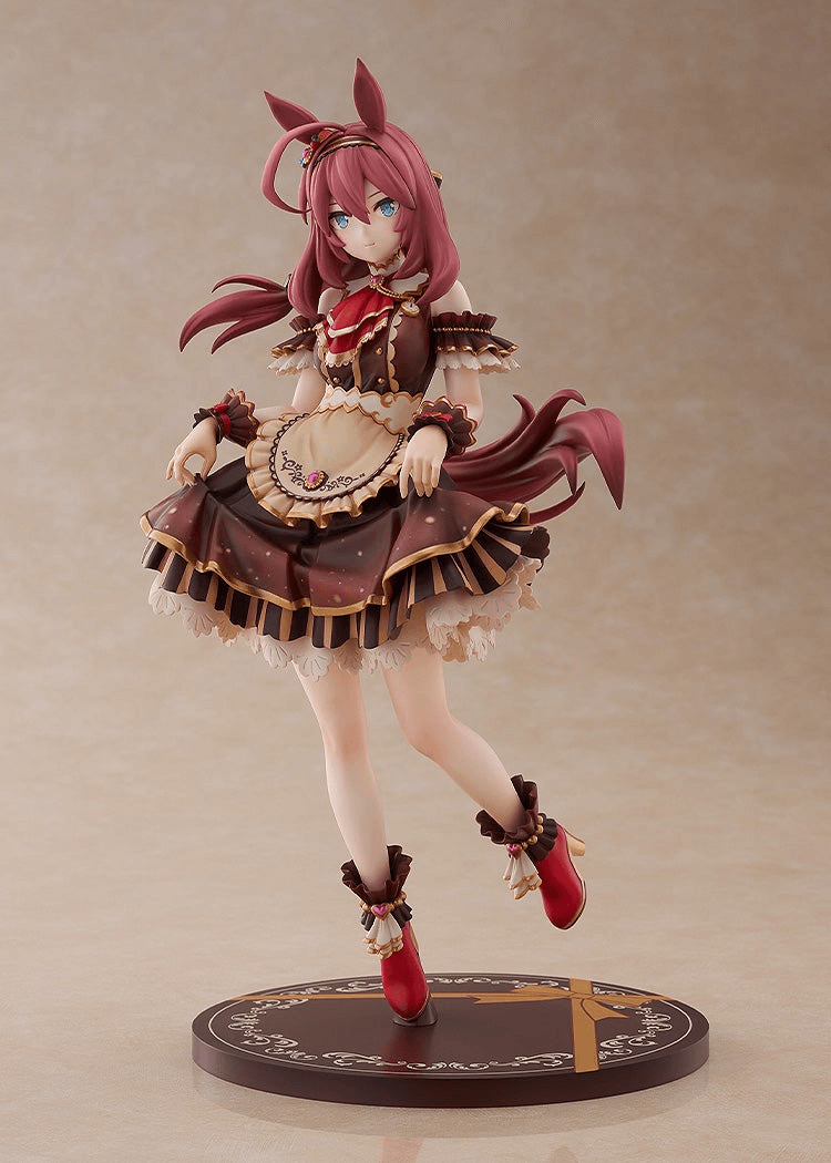 From the game Umamusume: Pretty Derby comes Mihono Bourbon! The figure features Ruby in a Valentine's Day [CODE: Grasage] outfit with her skirt fluttering outstretched. Dressed in her Valentine’s outfit, [CODE: ICING], Mihono Bourbon has been brought to life in a graceful pose, gently spreading her skirt. Her soft smile conveys a deep trust in her Master, radiating a charm that makes you want to stay by her side forever. The layered skirt is sculpted with rich, flowing detail, while the frills and accessories are carefully crafted down to the finest elements. Adorable fruit-shaped earrings, an oversized ribbon, and elegant brooches placed throughout the outfit add delightful accents you won’t want to miss. The coloring combines chocolate-like sweetness with chic elegance, featuring subtle gradations and textures that create a luxurious finish. From head to toe, Mihono Bourbon is filled with irresistible cuteness—be sure to welcome her into your collection!